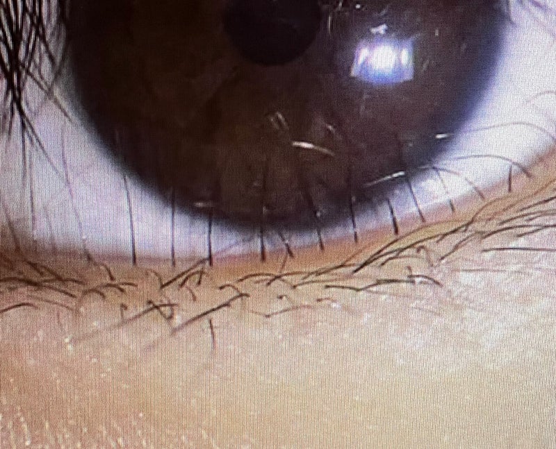 眼瞼縁だけは毛包と脂腺が分かれて存在し、それぞれが睫毛とマイボーム腺となっているのです。発生の段階でここにエラーが起きるとマイボーム腺から毛髪が生えてしまいます。これを睫毛重生(Distichiasis)と言います。