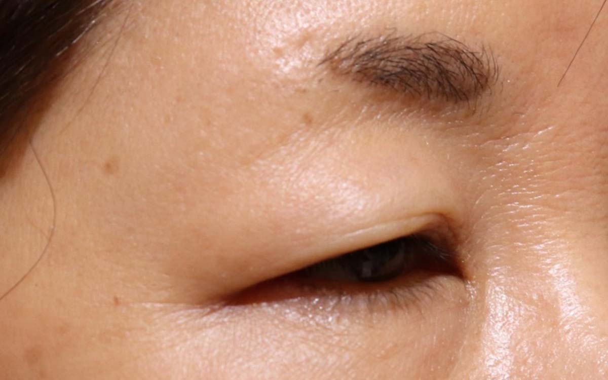 年齢とともに皮膚がたるんでいるため、中央から目じりにかけてほとんど目が開いていないように見えていたが、眉毛下で皮膚を切除したため、目を開くことが出来るようになった。3か月目だが傷はほとんど目立ちません。これからさらに綺麗になっていきます。
