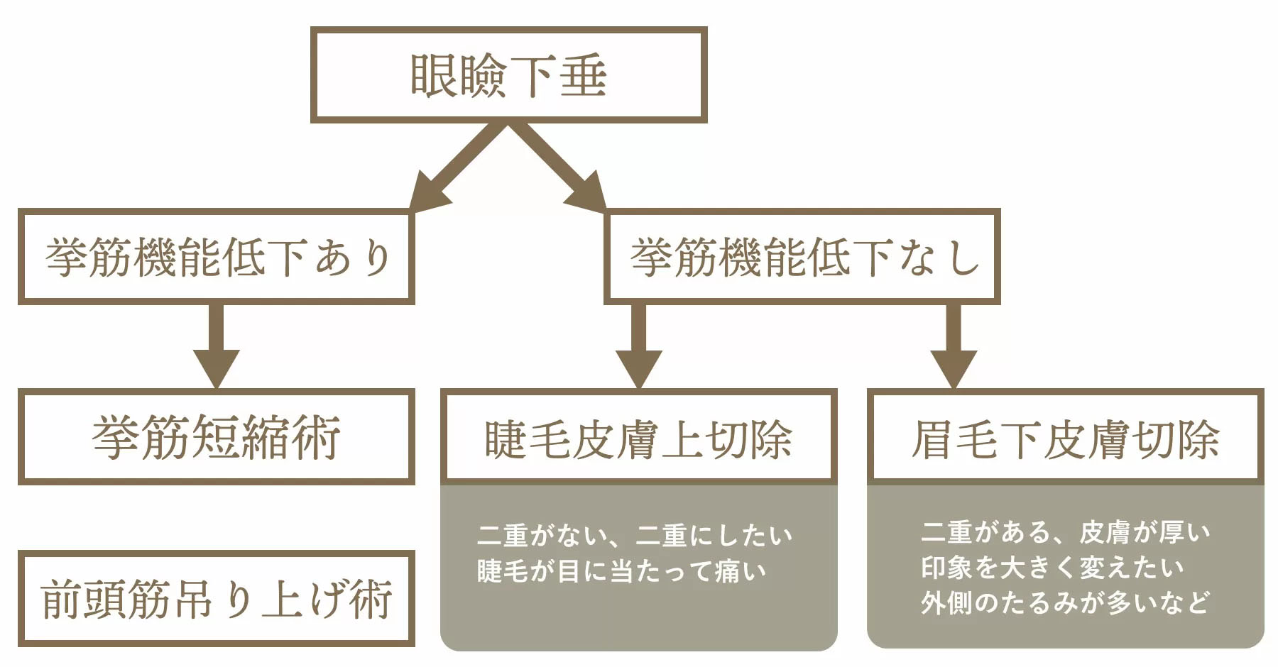 眼瞼下垂症に対する主な術式は大きく分けて4つあります。診察時にまぶたをあげる筋肉の機能(挙筋機能)を調べて手術の方法を決めます。①挙筋機能が低下している場合にはその程度に応じて「挙筋短縮術」や「前頭筋吊り上げ術」を、②挙筋機能の低下がなく皮膚のたるみのみの場合には「睫毛上皮膚切除」または「眉毛下皮膚切除(いわゆる眉下切開)」を選択することとなります。