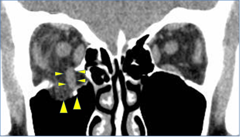 眼窩内壁が偏位し、篩骨洞内に突出している。内直筋が内側に偏位し、腫大しているように見える。(矢頭)