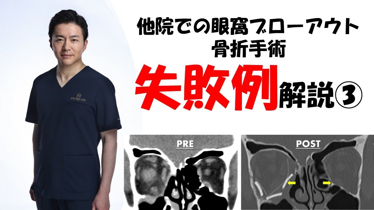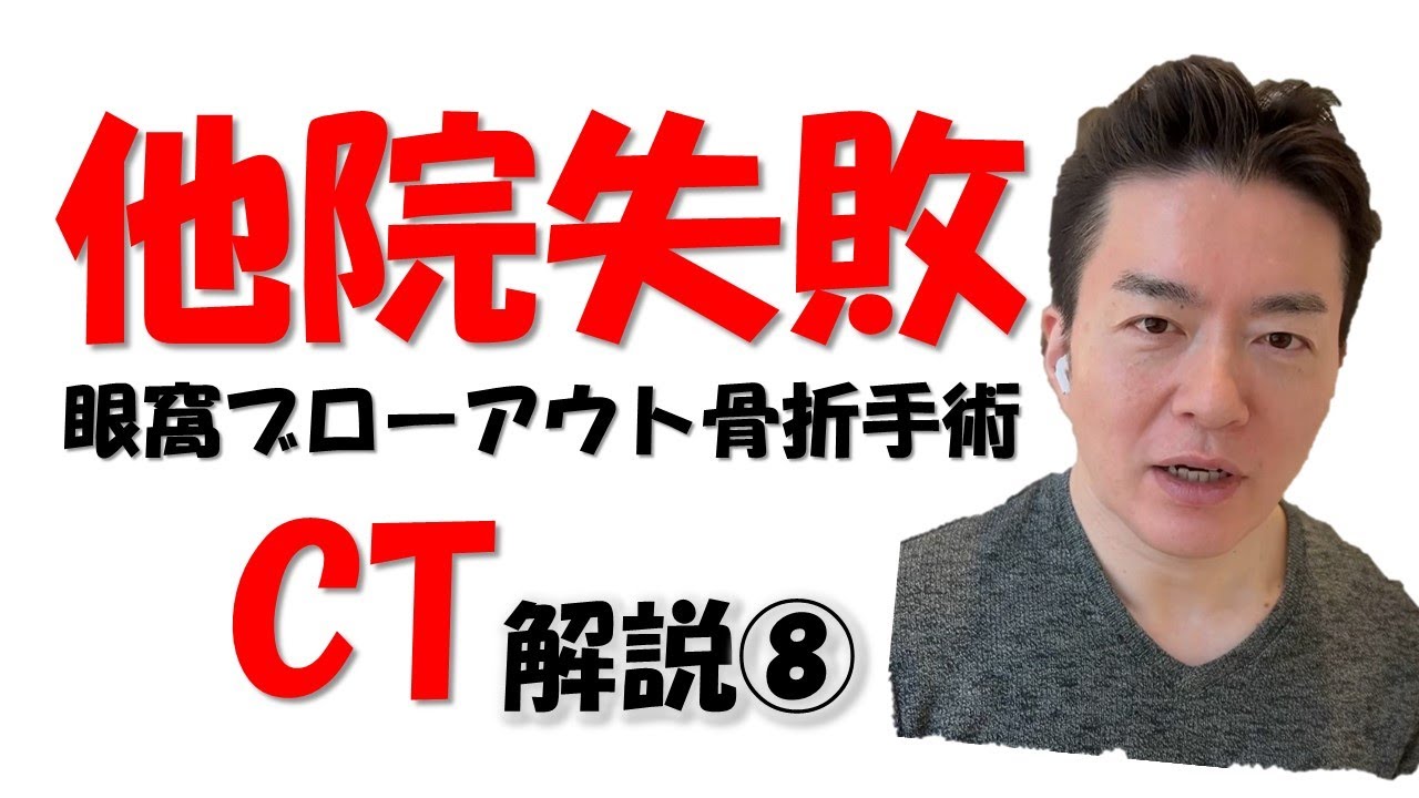 右眼の眼球陥凹は重度で、上眼瞼の影の形状が左右で大きく異なることが分かります。この方は内壁と下壁の骨折であり、その接合部(Orbital strutという)が折れていました。接合部が折れるのは、眼球運動障害よりも、眼球陥凹が強く出るタイプ。